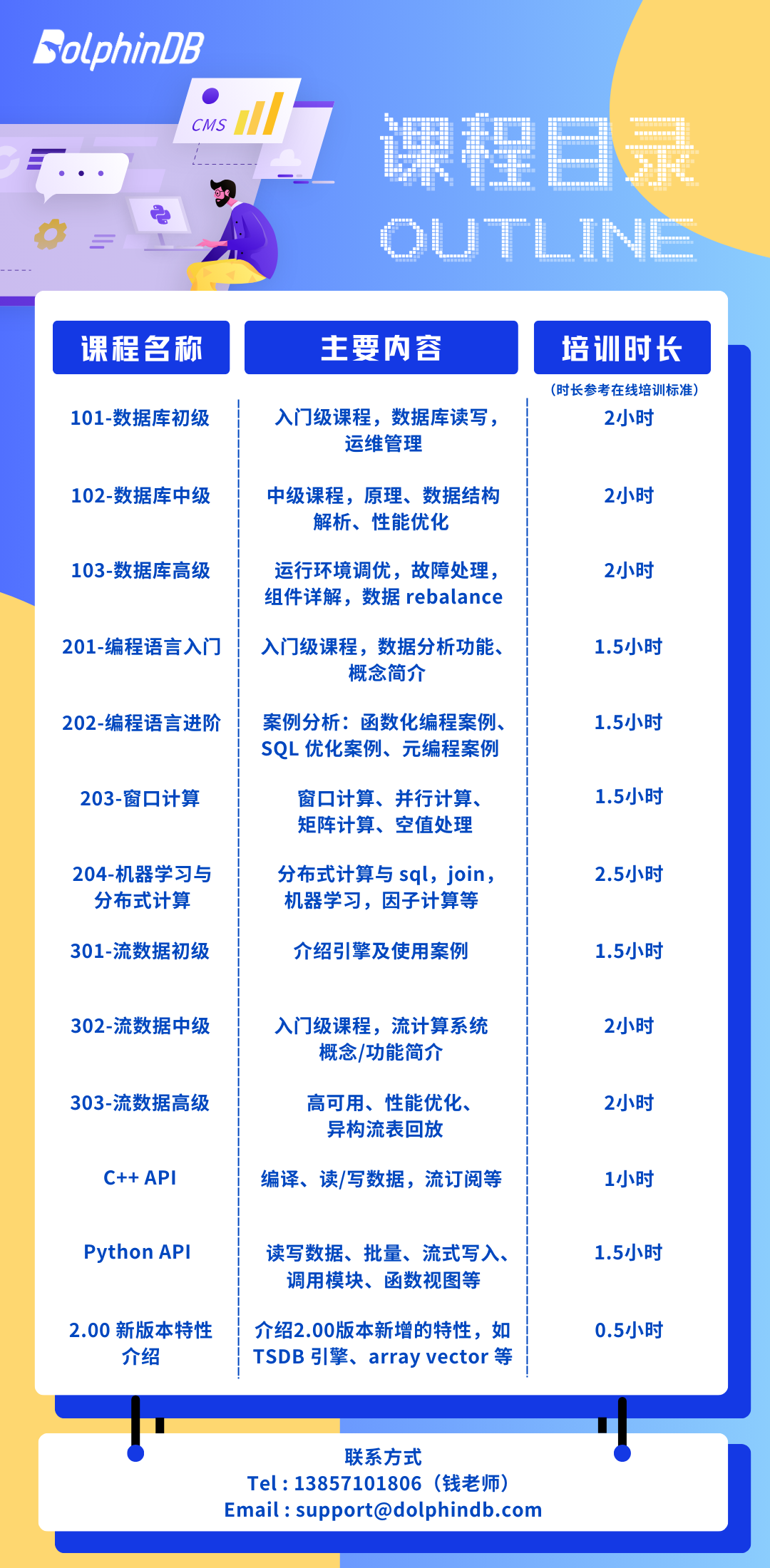 除了线上公开课,如果您也希望将您的团队成员短时间内迅速培养成为 DolphinDB 专家,欢迎提前联系您的客户经理或 DolphinDB 生态部门,将工程师派驻至 DolphinDB 杭州总部参加进阶培训。