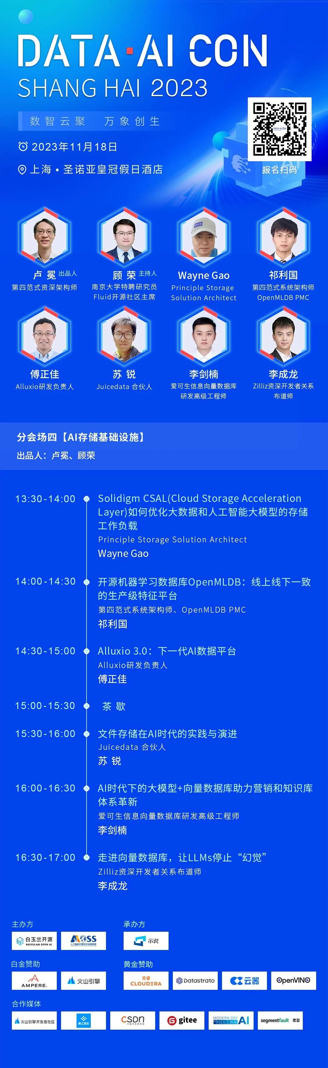 “数智云聚 万象创生”,上海白玉兰开源开放研究院、人工智能开源软件发展联盟联名主办、示说承办的【Data & AI Con Shanghai 2023】,将在2023年11月18号,于上海圣诺亚皇冠假日酒店盛大举行。