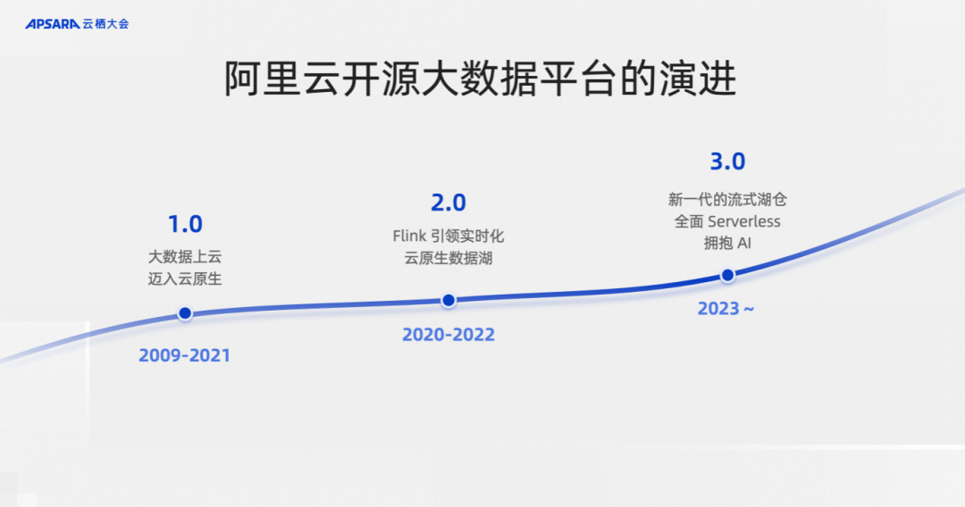 阿里云开源大数据平台孵化于阿里巴巴集团内部业务。早在 2009 年,我们就开始采用开源 Hadoop 技术体系来服务阿里内部快速发展的电商业务。在阿里巴巴内部这套 Hadoop 技术体系,当时叫云梯一,当发展成熟后,开始上云。我们在阿里云上推出了第一款开源大数据产品 E-MapReduce,简称 EMR 。我们把这个定义为开源大数据平台的第一阶段,也就是 1.0 的时代,从此刻开始,真正跨入云原生时代。