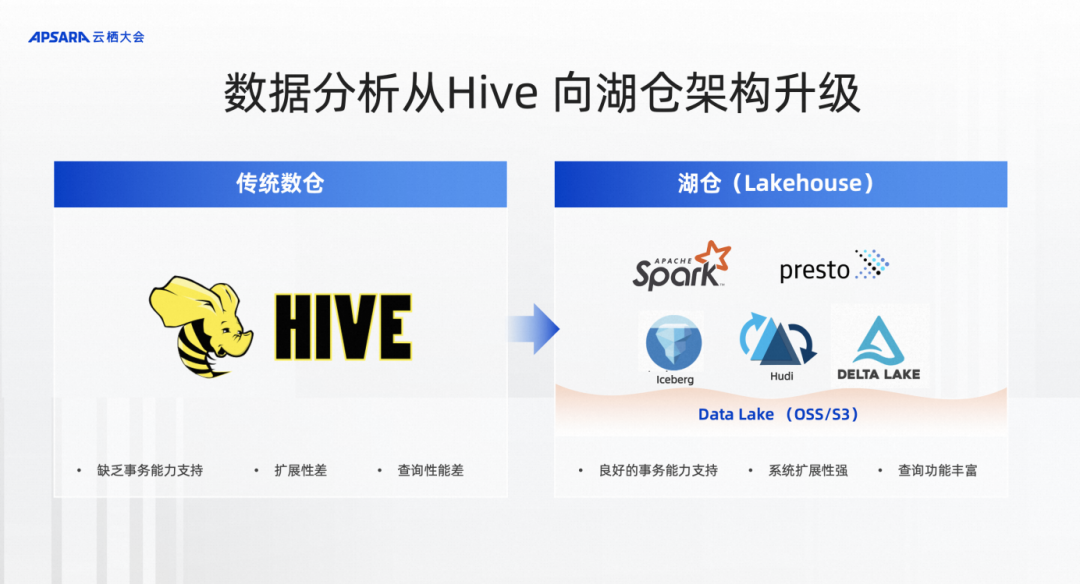 首先介绍一下,新一代的数据分析架构——流式湖仓。我相信绝大部分用户意识到传统 Hadoop Hive 数仓架构的局限性以及技术发展的趋势,都开始将传统的 Hadoop 技术向着 新一代的湖仓分析 Lakehouse 架构进行演进。
