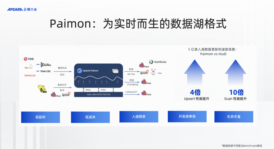 Paimon 是真正为实时更新而设计的数据湖格式,并且是完全开放的,不仅支持 Flink,也会支持 Spark、Presto、Trino、StarRocks 等主流计算引擎。