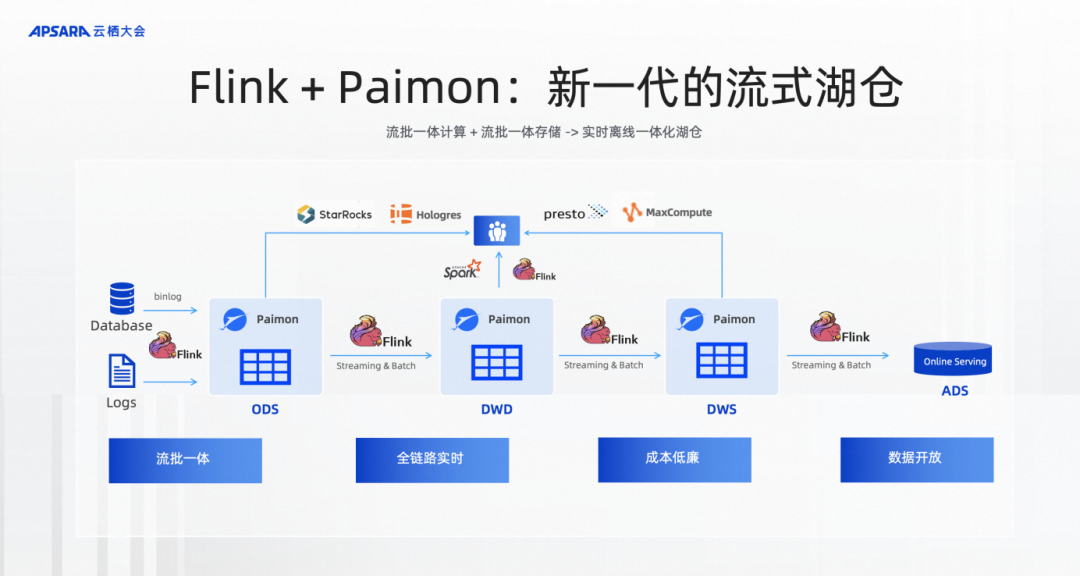 因此,基于 Flink 和 Paimon,我们推出新一代的流式湖仓的数据分析技术,从整个数据的实时入湖到湖上实时 ETL 数据更新,采用一整套统一的 SQL 在 Lakehouse 来进行全链路的实时数据处理。由于 Paimon 的开放性,我们完全也可以在这个架构中引入大家用得比较多的 Spark、Presto、StarRocks 这些开源分析引擎,也包括阿里云自研引擎 MaxCompute、Hologres 都可以和 Paimon 数据进行无缝对接,实现完全开放的湖仓体系,从而整个链路实现完整的生态,不仅能够实现数据全链路的实时流动,也能实现数据全链路的实时分析。这是整个 3.0 中数据分析架构中的演进趋势,推动湖仓的实时化。