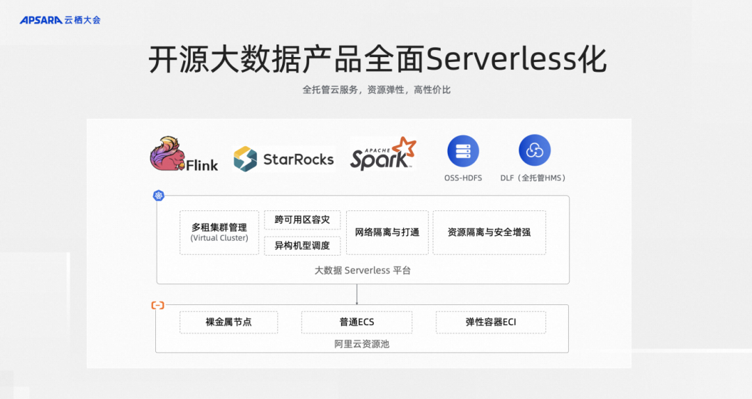 第二个,想介绍一下产品架构,我们的产品和云原生结合也迈出了重要一步,希望开源大数据平台实现全面的 Serverless 化。其实 Serverless 这个技术已经探索了有好几年,两年前就推出了开源大数据平台的第一款 Serverless 产品—— Serverless Flink,在阿里云上有非常多的客户使用。