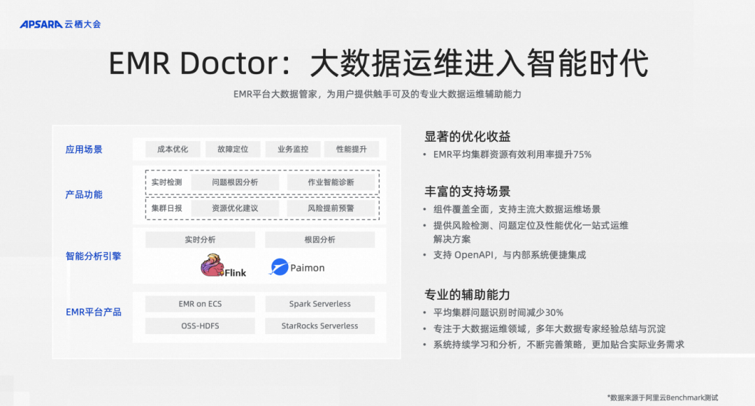 当前 AI 全面爆发,阿里云开源大数据平台也将 AI 技术引入大数据平台体系中,帮助我们做智能化平台运维或者数据管理等。今年,我们升级了智能化运维工具 EMR Doctor、Flink Advisor,并已广泛应用于客户和阿里云内部平台运维,平均集群问题识别时间减少 30% ,集群资源有效利用率提升 75%,帮助阿里云开源大数据平台实现智能化运维和数据管理。