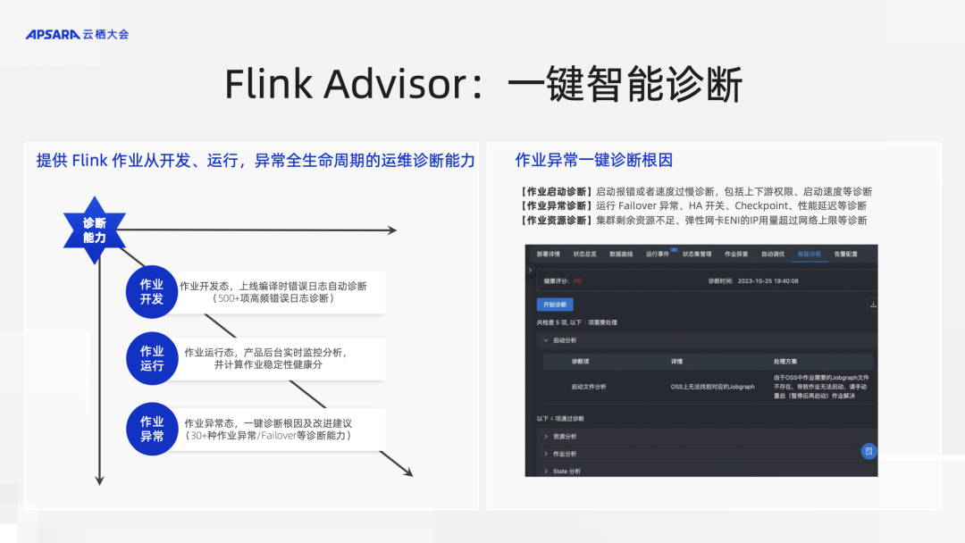 此外。在 Flink 产品中也做了大量的实践,推出了智能诊断的服务 Flink Advisor。可以在开发运维的全生命周期中帮助用户定位,你的任务为什么出错了,出错在哪里,怎么修正、改进。即使在你的任务没有问题的时候也依然对你的任务做健康检测,判断潜在可能出现的风险,类似于健康分这种能力,帮助用户防范于未然,给用户一些智能化的提议,让用户去优化任务。其实这背后都是采用了大数据 AI 相结合的分析技术做到的。
