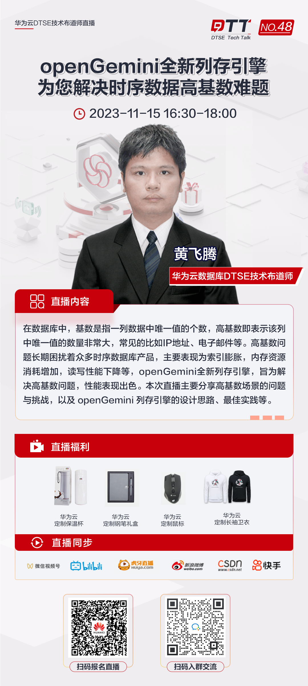 11月15日16:30-18:00华为云开源DTSE技术布道师、华为云数据库创新Lab技术专家黄飞腾将带来《openGemini全新列存引擎,为您解决时序数据高基数难题》的主题分享。