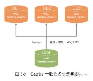 通过 barman 恢复数据,recovery.conf 基于 barrier 的恢复,确保集群各个数据节点均恢复到一致的状态(全局 barrier 点),如图 3-9 所示。