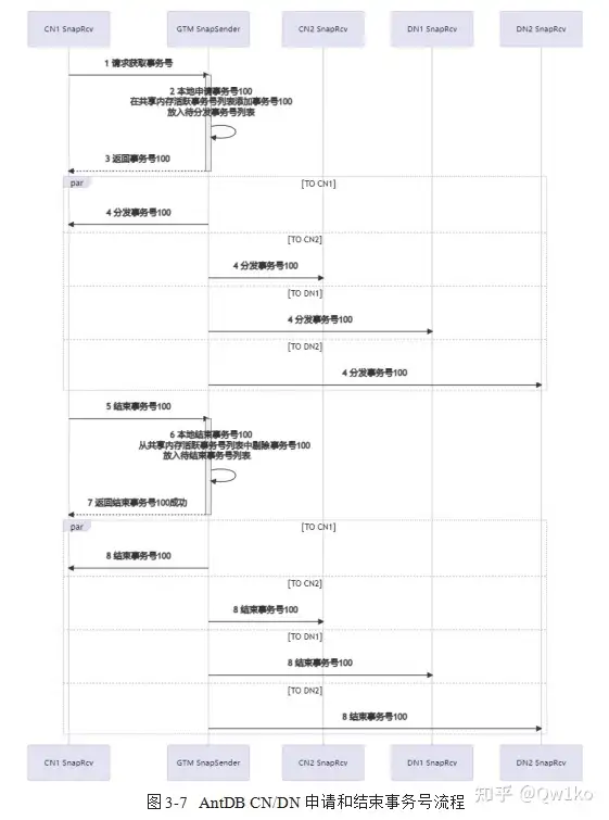 AntDB 5.0 优化了 GTM 事务号和 SnapShot 分发流程,减少了 CN 和 GTM的实时交互,并实现了一种 CN 在本地获取 SnapShot 的方法。AntDB CN/DN申请和结束事务号流程如图 3-7 所示。