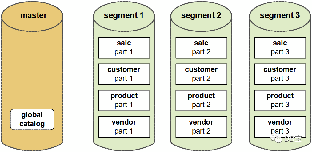 Greenplum是一个分布式数据库系统,因此其所有的业务数据都是物理存放在集群的所有Segment实例数据库上;在Greenplum数据库中所有表都是分布式的,所以每一张表都会被切片,每个Segment实例数据库都会存放相应的数据片段。在下图中sale、customer、vendor、product四张表的数据都会切片存放在所有的Segment上,所有Segment实例同时工作,由于每个Segment只需要计算一部分数据,所以计算效率会大大提升。