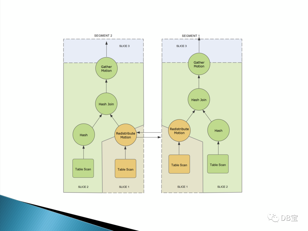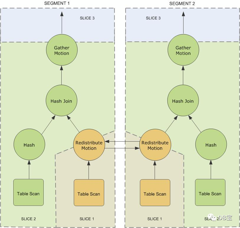上图和下图所示查询计划在Master和两个Segment实例上的查询工作者进行。