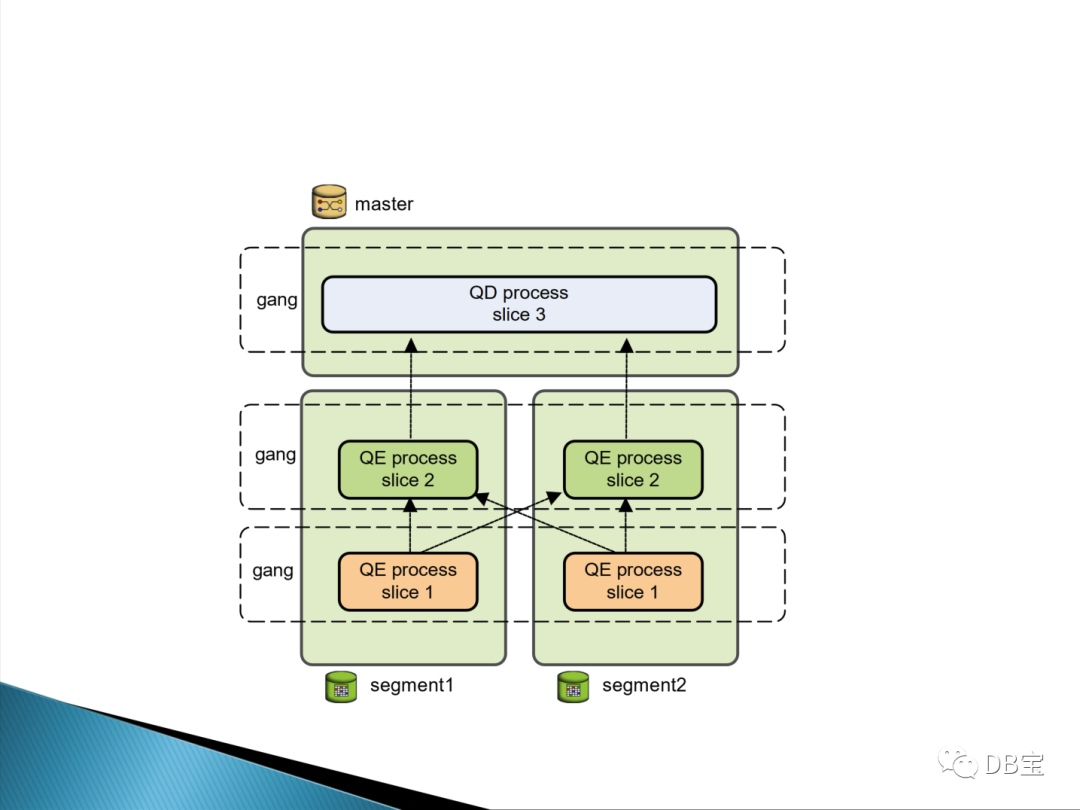 然后看看这个查询计划的执行。主节点(Master)上的调度器(QD)会下发查询任务到每个数据节点,数据节点收到任务后(查询计划树),创建工作进程(QE)执行任务。如果需要跨节点数据交换(例如上面的HashJoin),则数据节点上会创建多个工作进程协调执行任务。不同节点上执行同一任务(查询计划中的切片)的进程组成一个团伙(Gang)。数据从下往上流动,最终Master返回给客户端。