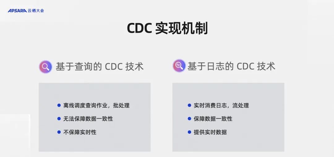 基于日志的 CDC 技术。这就是基于数据库的变更日志解析变更的技术,比如大家都知道 MySQL 的数据库有 Binlog 的机制。基于数据库的变更日志的 CDC 技术可以做到实时消费日志做流处理,上游只要更新一条数据,下游马上就能感知到这一条数据,可以保障整个数据的强一致性,还可以提供实时的数据。基于日志的 CDC 技术通常实现复杂度上会比基于查询的方式更高一些。