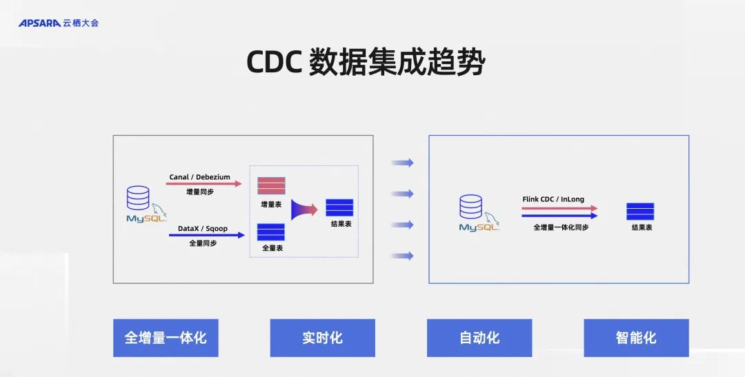 智能化就是一张 MySQL 里面的业务表,随着业务的变化是不断在变的,不仅是数据在变,里面的表结构都会变。应对这些场景,数据集成的作业能不能保持健壮,进而能不能自动地、智能地处理上游的这些变更,这是一个智能化的诉求,这也是 CDC 数据集成的趋势。