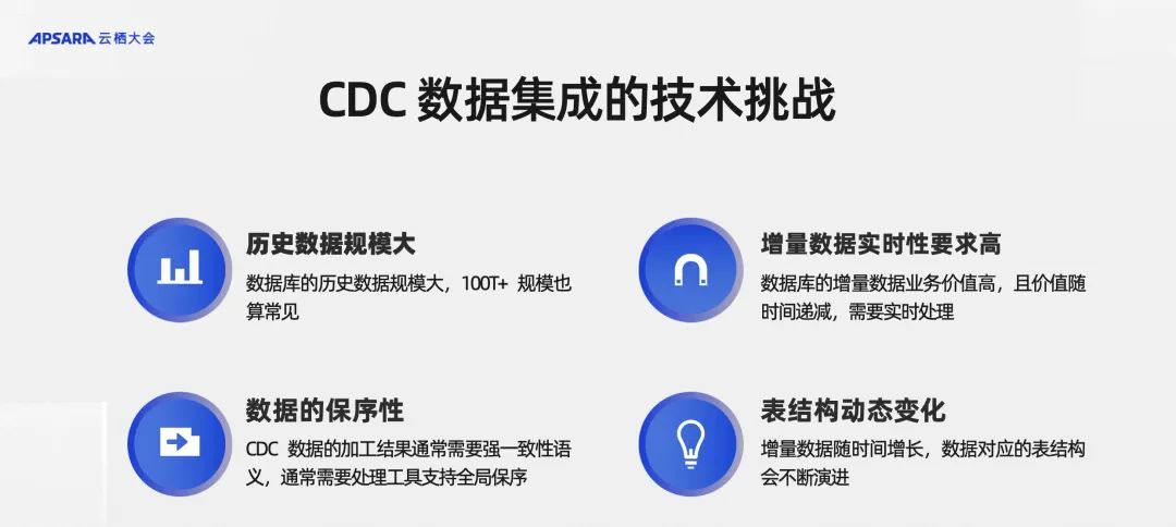 第一,历史数据规模很大,一些 MySQL 单表能够达到上亿或者基几十亿的级别,在分库分表的场景,甚至有更大的历史数据规模。 第二,增量数据那部分实时性要求越来越高,比如说现在的湖仓场景都已经需要 5 分钟级的低延迟。在一些更极端的场景中,比如说风控、CEP 规则引擎等等应用场景甚至需要秒级、亚秒级的延迟。 第三,CDC 数据有一个重要的保序性,全量和增量能不能提供一个跟原始的 MySQL 库里面一致性的快照,这样的保序性需求对整个 CDC 的集成框架提出了很大的挑战。 第四,表结构变更,包括新增字段和已有字段的类型变更,比如一个字段业务开发长度升级了,这样的变更框架能不能自动地支持,这都是 CDC 数据集成的技术挑战。