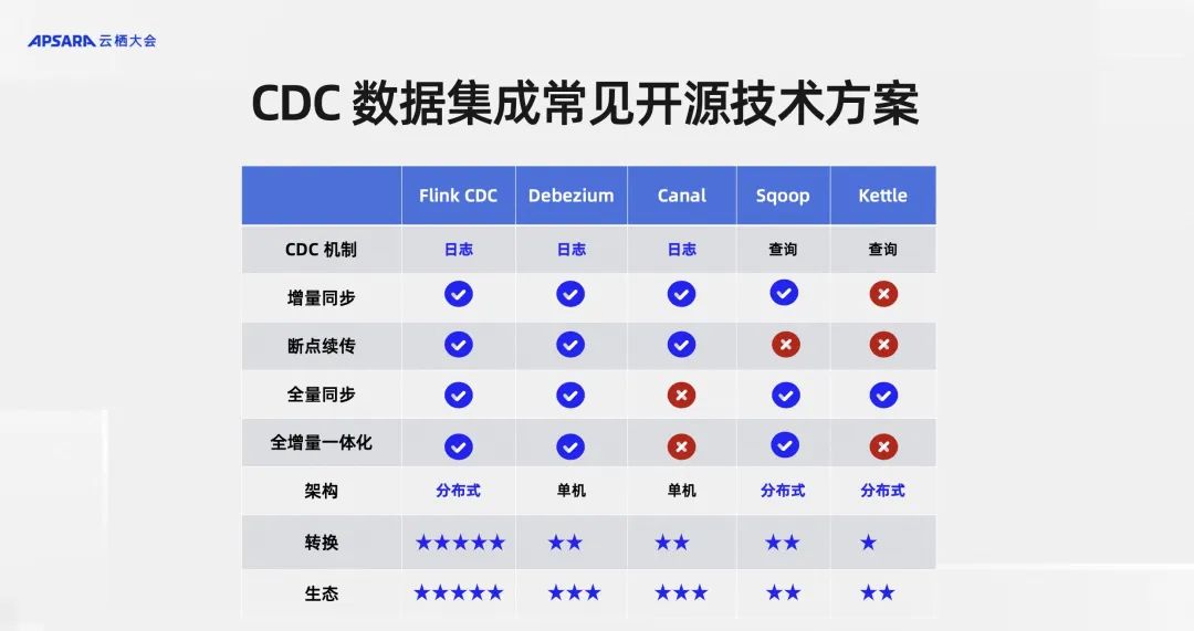 其次是断点续传,断点续传就是全量数据历史规模很大,同步到一半的时候能不能停下来再次恢复,而不是从头开始重刷数据。全量同步维度就是框架支不支持历史数据同步。全增量一体化维度泽是全量和增量过程是框架解决的还是要开发人员手动解决。架构维度则是评价 CDC 框架是可扩展的分布式架构,还是单机版。转换维度衡量的是 CDC 数据在数据集成做ETL的时候往往要做一些数据清洗,比如说做一个大小写转换,这个框架能不能很好地支持,比如需要做一些数据的过滤,框架能不能很好地支持,以及另外一个就是这个工具的上下游生态,框架上游支持多少数据源,下游的计算引擎能支持哪些,支持写入的湖仓有哪些,因为在选择一个 CDC 数据集成框架或者工具的时候肯定是结合整个大数据团队其他产品的架构设计统一考虑的。从上述这几个维度分析,Flink CDC 在这几个维度下的表现都非常优秀。