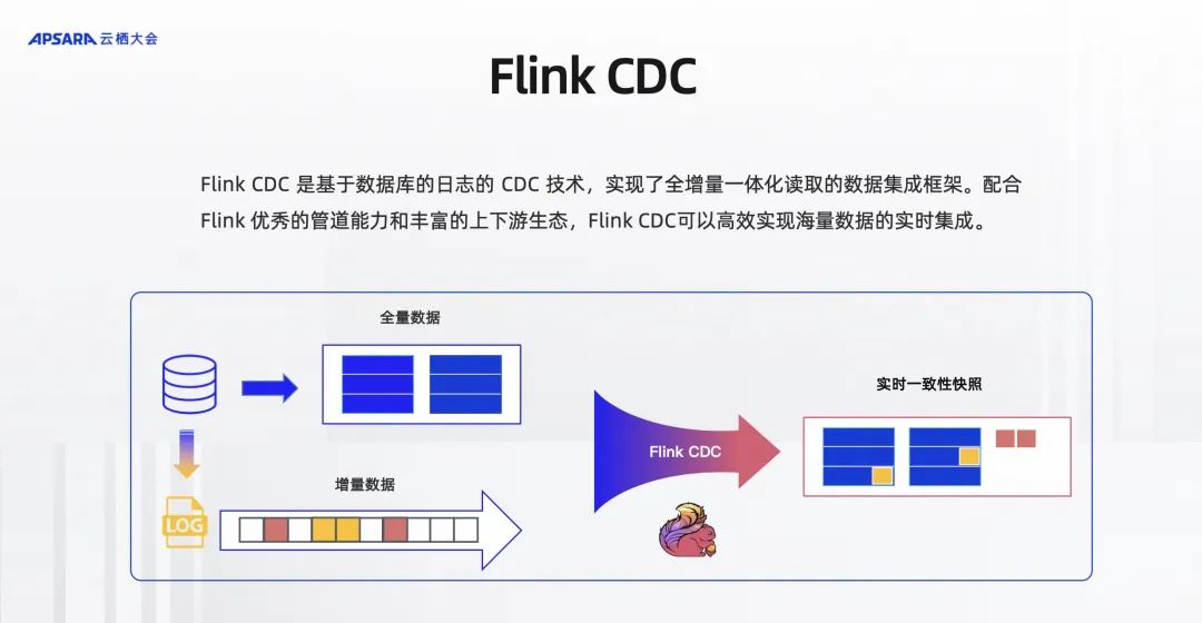 Flink CDC 是基于数据库日志的 CDC 技术及实现了全增量一体化读取的数据集成框架,配合 Flink 优秀的管道能力和丰富的上下游生态,Flink CDC 可以高效实现海量数据的实时集成。如图所示,比如说 MySQL 有一张表有历史的全量数据,也有源源不断写入的增量数据、业务更新的增量数据 MySQL 都会先存在自己的 Log 里面,Flink CDC 既读取全量数据,又通过基于日志的 CDC 技术读取增量数据,并且给下游提供实时一致性的快照,框架提供了全量和增量的自动对接,保证了不丢不重的数据传输语义,开发者不用关心底层的细节。