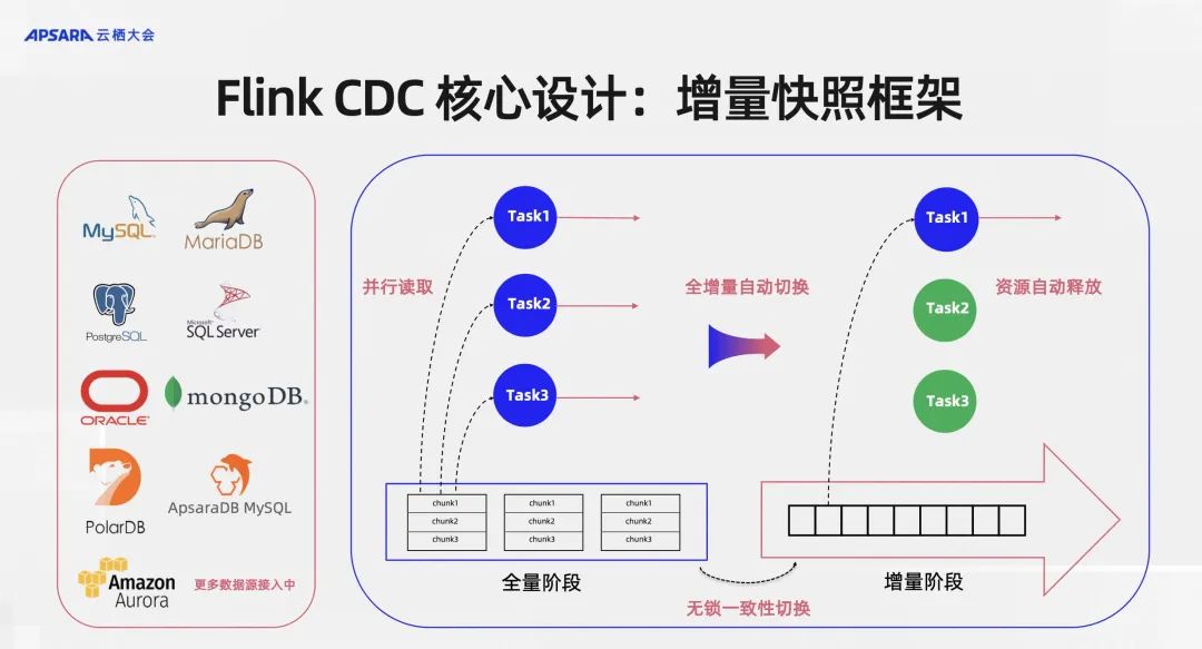 第一个是增量快照框架。这是我在 Flink CDC 2.0 的时候提出的一个增量快照算法,后面演变成增量快照框架。左边的这些数据源是现在 Flink CDC 社区已经支持或者已经接入的增量快照框架。增量快照框架体现的是什么能力呢?在读取数据一张表到全量数据的时候可以做并行读取,这张表即使历史数据规模很大,只要增加并发、扩资源,这个框架是具备水平扩容的能力,通过并行读取可以达到扩容的需求。