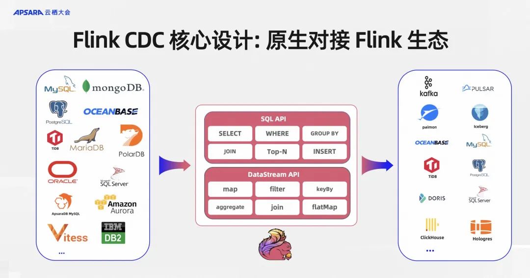 在原生对接到 Flink 的生态之后,Flink 上支持的所有下游,比如说消息队列、Kafka、Pulsar,数据湖 Paimon 或者传统的数据库,Flink CDC 都可以直接写入。