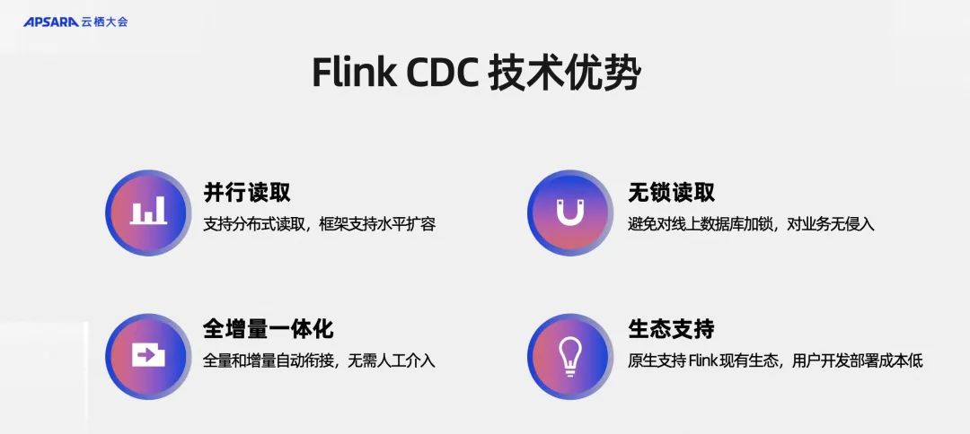 第一,并行读取。这个框架提供了分布式读取的能力,Flink CDC 这个框架可以支持水平扩容,只要资源够,读取的吞吐可以线性扩展。 第二,无锁读取。对线上的数据库和业务没有侵入。 第三,全增量一体化。全量和增量之间的一致性保障、自动衔接是框架给解决的,无需人工介入。 第四,生态支持。我们可以原生支持 Flink 现有生态,用户开发部署成本低。如果说开发者已经是一个 Flink 用户,那他不需要安转额外的组件,更不需要部署比如 Kafka 集群,如果是 SQL 用户只需要将一个 connector jar 包放到 Flink 的 lib 目录下即可。