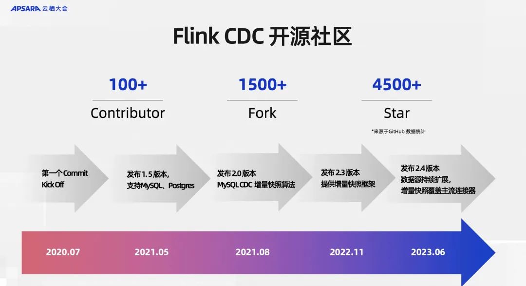 还有一个听众可能比较感兴趣的点,Flink CDC 这个项目是完全开源的,并且从诞生的第一天就是从开源社区出来的,到现在已经从 0.x 版本发到最新的 2.4.2 版本,在全体社区贡献者的维护下已经走过三年,作为个人兴趣项目逐步打磨起来的开源项目,三年的时间这个社区的发展是非常迅速的。这里讲的发展并不只是说 Github Star 4500+ 的非常快速的发展,其实我们更看重的是代码 Fork 数和社区贡献者数量。Fork 数指标表示了有多少组织、多少的开源社区贡献者在使用 Flink CDC 仓库,比如说 Apache InLong 这样的顶级项目都是集成了 Flink CDC。