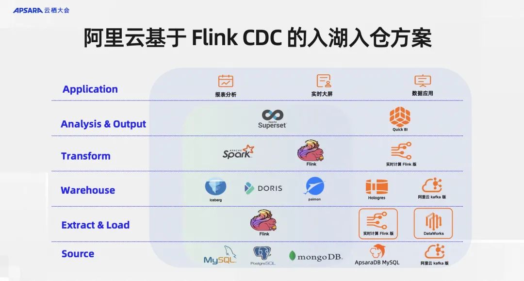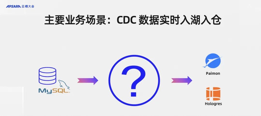 在阿里云上,我们 Flink CDC 最主要的业务场景就是CDC数据实时入湖入仓。比如说我的业务库是 MySQL,当然其他数据库也一样,其实就是要把 MySQL 里面的数据一键同步到湖仓里面,比如说 Paimon、Hologres, 业务场景就是 CDC 数据实时入湖入仓,这个场景下用户的核心诉求什么?