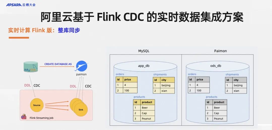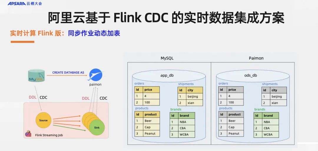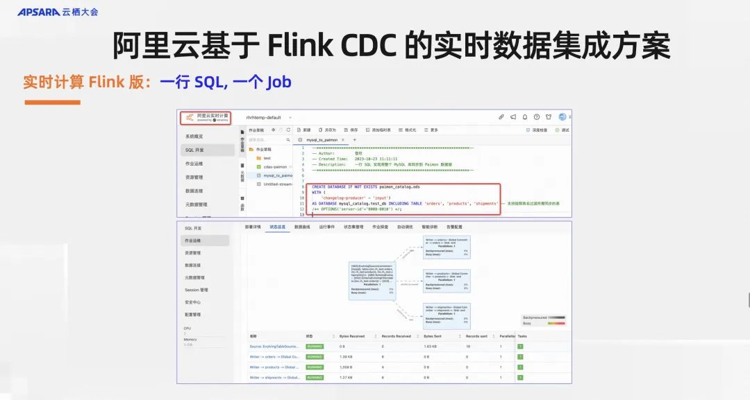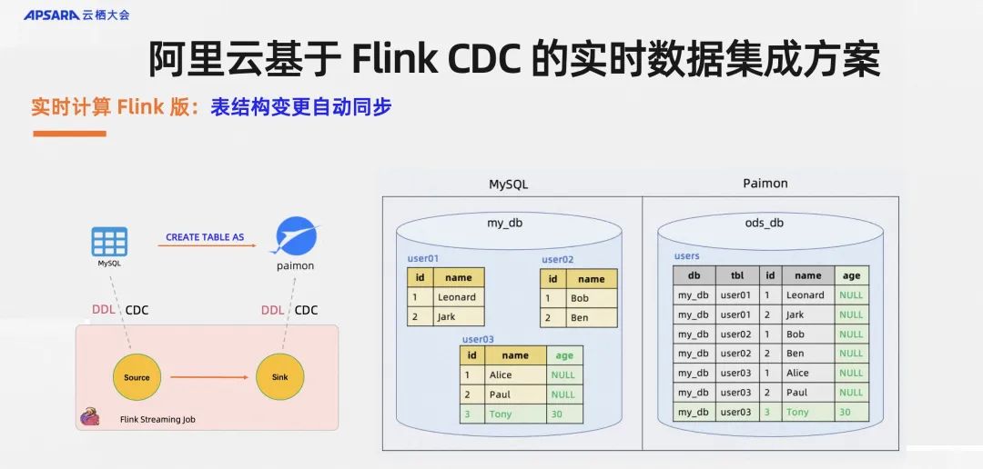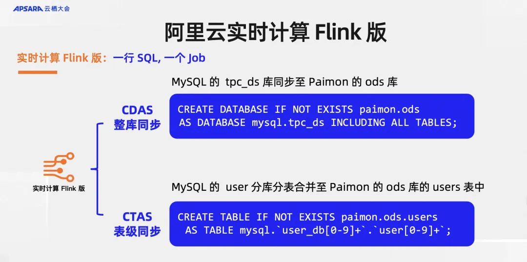在阿里云实时计算 Flink 版我们设计两个语法糖,分别是 CDAS(Create Database As Database)和 CTAS(Create Table As Table)。CDAS 就是通过一行 SQL 实现整库同步,比如说 MySQL 里面有一个 TPS DS 库同步至 Paimon 的 ODS 库就可以搞定。同时我也提供 CTAS,比如说在应对分库分表的重点业务时,可能对单表要做一些分库分表的合并,合并到 Paimon 里面做一个大宽表等等,多个表合成一个表的逻辑。这个表还会做一些事情,比如要推导最宽的表结构,以及分表的表结构变化了之后,在下游最宽的表里面也要看到对应表结构的同步,这些是通过 CTAS 实现的。