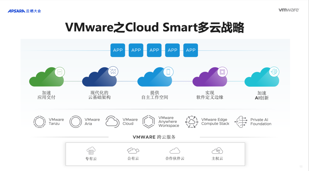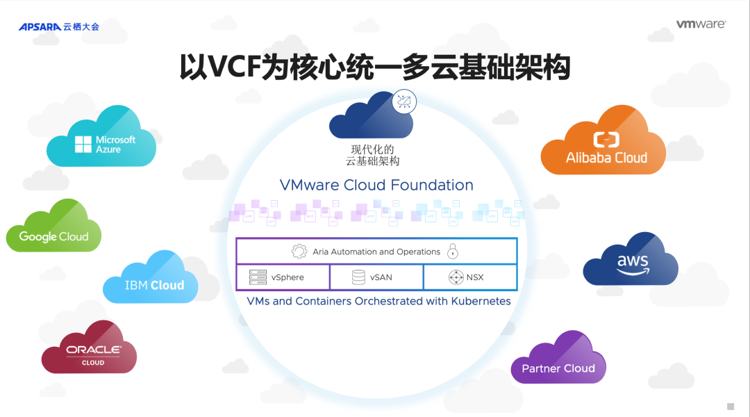 VMware 将其多云战略与阿里云智能的开放生态相结合,以 VCF (VMware Cloud Foundation)为核心,帮助企业用户打通专属云、公有云、边缘云、行业云、合作伙伴云、主权云等复杂的多云环境,真正实现 Cloud Smart 愿景。结合阿里云领先的市场地位和从底层算力到 AI 平台再到模型服务的全栈技术创新,共同帮助企业用户在复杂多变的宏观环境下实现运营的攻守平衡,持续创造业务价值。