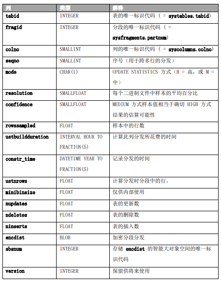 具有给定 tabid、fragid 和 colno 值组合的行集用于标识该表分段的列统计信息。通过将 seqno 列用于排序号,这些统计信息可跨多行。 在计算分段列统计信息的 UPDATE STATISTICS MEDIUM 或 HIGH 语句中指定的 mode、 resolution 和 confidence 值会记录在相同名称的 sysfragdist 列中。要使用现有分段统 计信息来构建表统计信息,这三个参数在引用相同表的分段的 UPDATE STATISTICS 语句之 间不应该更改。唯一例外是“H”方式分段统计信息可用于构建“M”方式表统计信息。 分段的列分发统计信息存储在 BLOB 列 encdist 中。sbsnum 列存储了描述此分段的