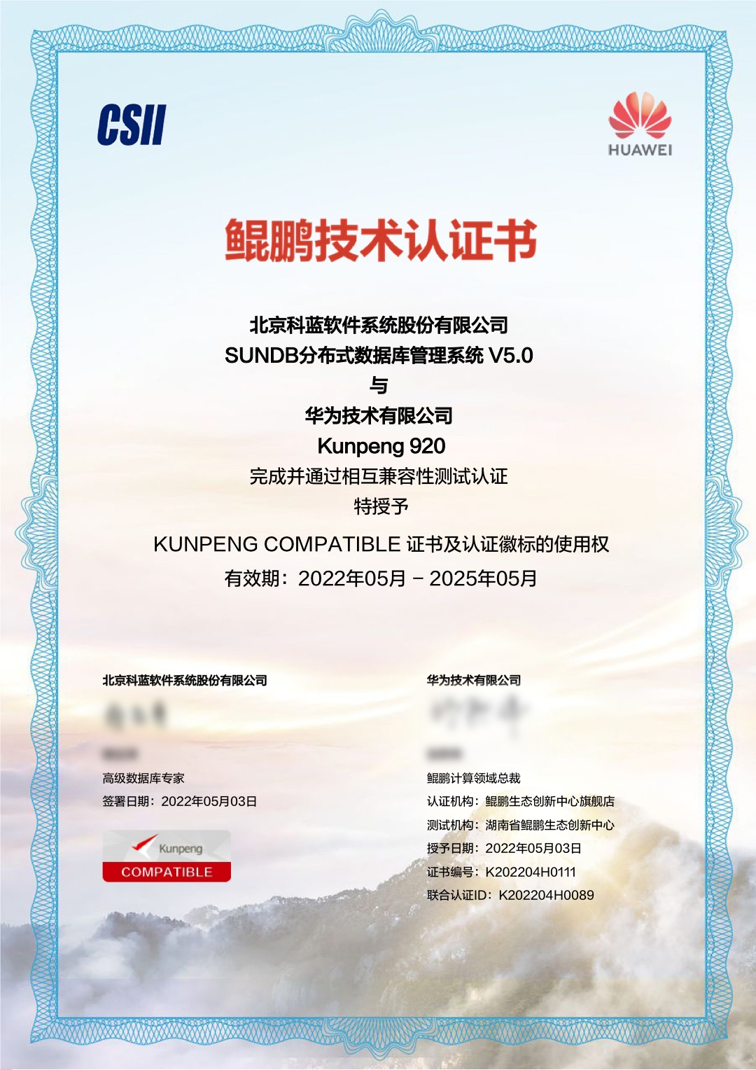 北京科蓝软件系统股份有限公司自主研发的SUNDB分布式数据库管理系统 V5.0通过华为Kunpeng 920的相互兼容性测试。经过严格的联合测试验证,双方产品兼容性良好,运行稳定、安全,可以满足用户的关键性应用需求。