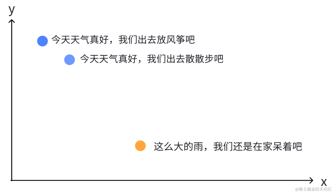 向量 Embedding 是在自然语言处理和机器学习中广泛使用的概念。各种文本、图片或其他信号,均可通过一些算法转换为向量化的 Embedding。在向量空间中,相似的词语或信号距离更近,可以用这种性质来表示词语或信号之间的关系和相似性。例如,通过一定的向量化模型算法,将如下三句话,转换成二维向量(x,y),我们可通过坐标系来画出这些向量的位置,它们在二维坐标中的远近,就显示了其相似性,坐标位置越接近,其内容就越相似。如下图所示: