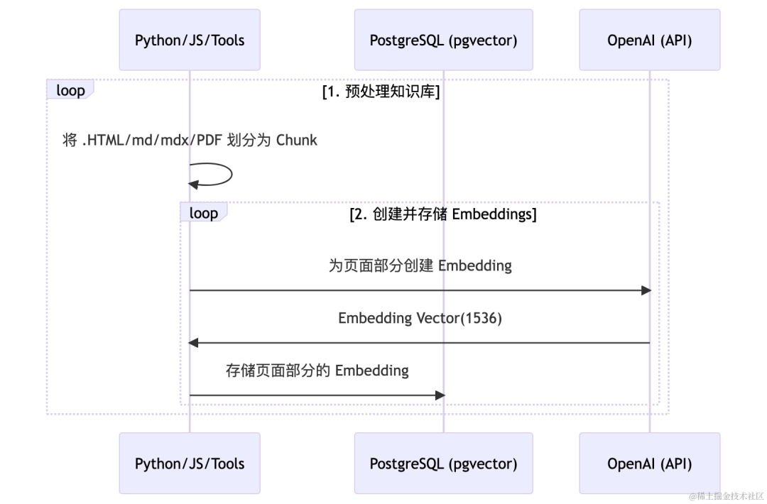 其大致可以分为两个阶段:向量构建阶段和问答阶段。在向量构建阶段,将企业知识库的所有文档,分割成内容大小适当的片段,然后通过 Embeddings 转换算法,例如 OpenAI 的模型 API(https://platform.openai.com/docs/guides/embeddings/what-are-embeddings),将其转换成 Embeddings 数据,存储于云数据库 PostgreSQL 版向量数据库中,详细流程如下图所示: