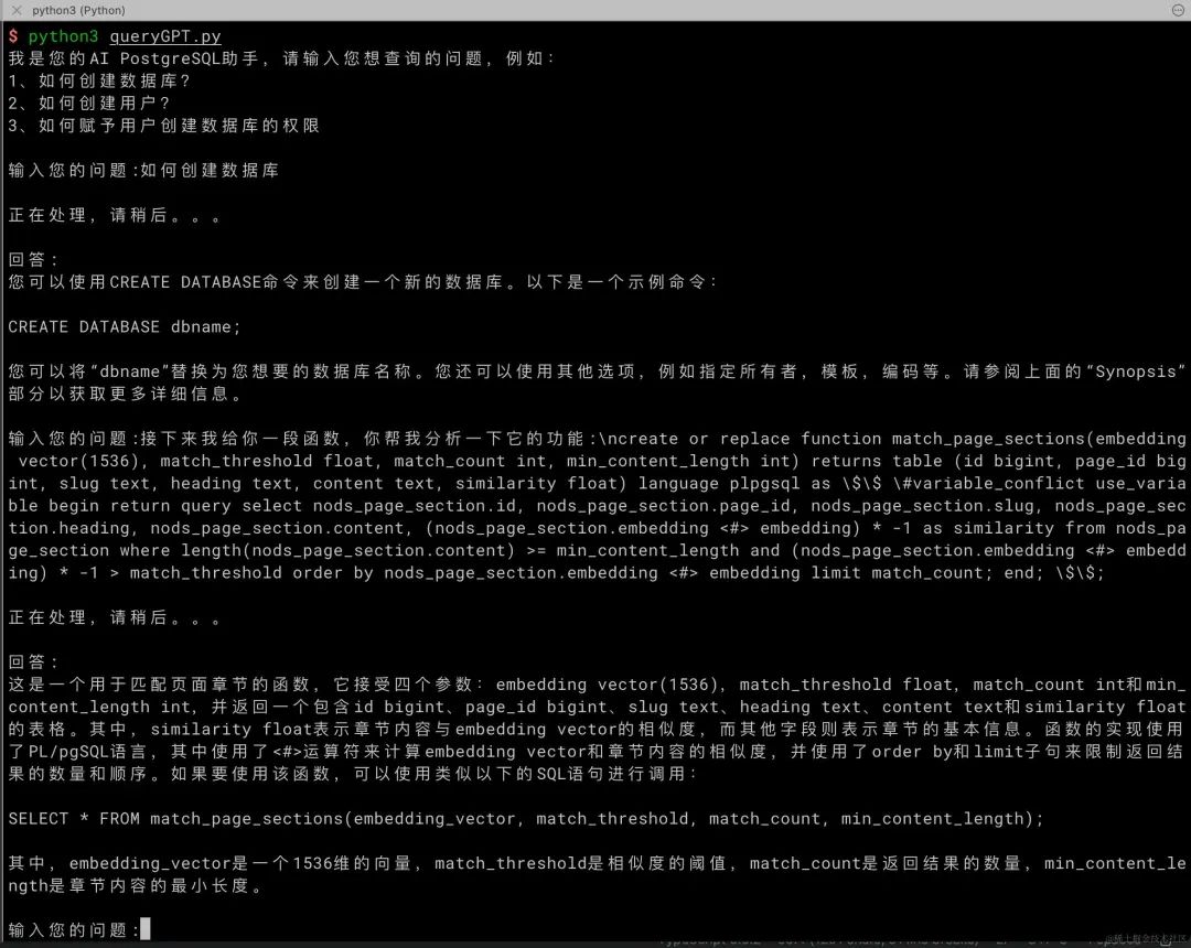 print('我是您的PostgreSQL AI助手,请输入您想查询的问题,例如:\n1、如何创建table?\n2、给我解释一下select语句?\n3、如何创建一个存储过程?')