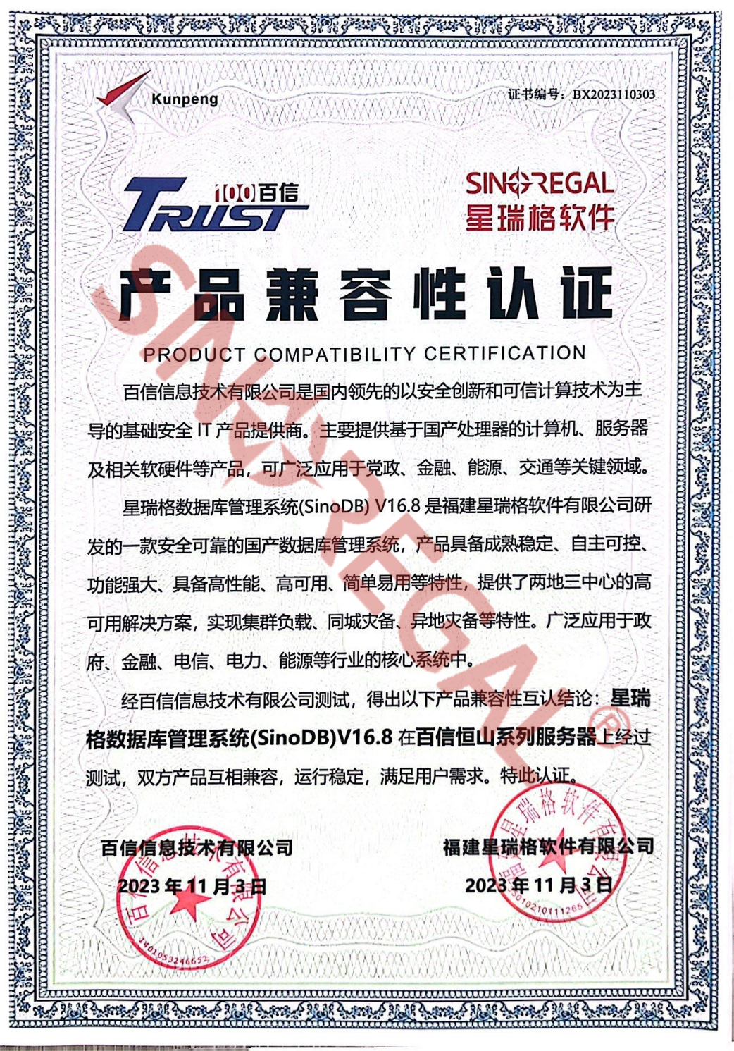 近日,福建星瑞格软件有限公司(以下简称星瑞格)与百信信息技术有限公司(以下简称百信)完成了星瑞格数据库管理系统(SinoDB)V16.8与百信恒山系列服务器的产品兼容互认证。