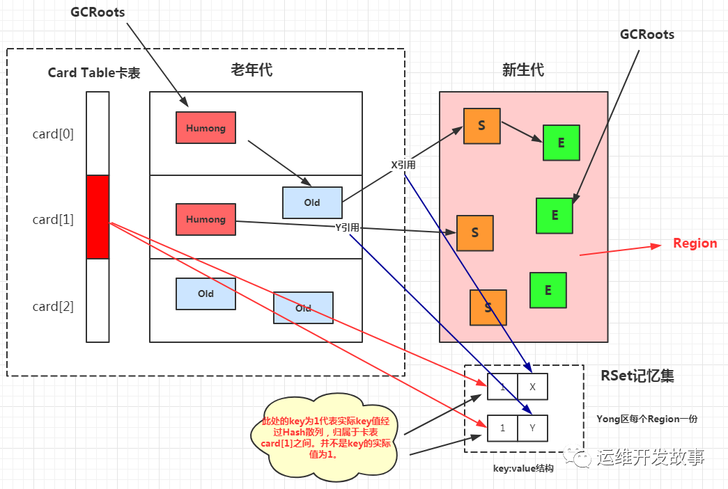 由于新生代GC时,需要扫描整个old区,效率非常低。所以old区就是用卡表的方式进行一次逻辑分区。一般一页卡表的大小是2的n次幂。每一个区域也是用Key,Value结构进行记录。每一区域记录为Key不重复,Value则记录这片区域的老年代对象与新生代对象是否存在引用关系,存在则标记为1,否则为0。记录完毕后把value为1的key作为ReSet的key进行记录,并且ReSet的value存储引用,从而提高跨代引用的查询效率。