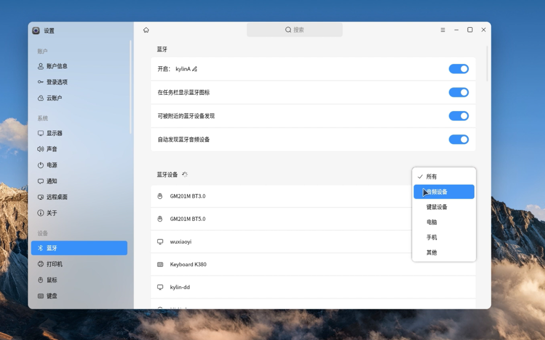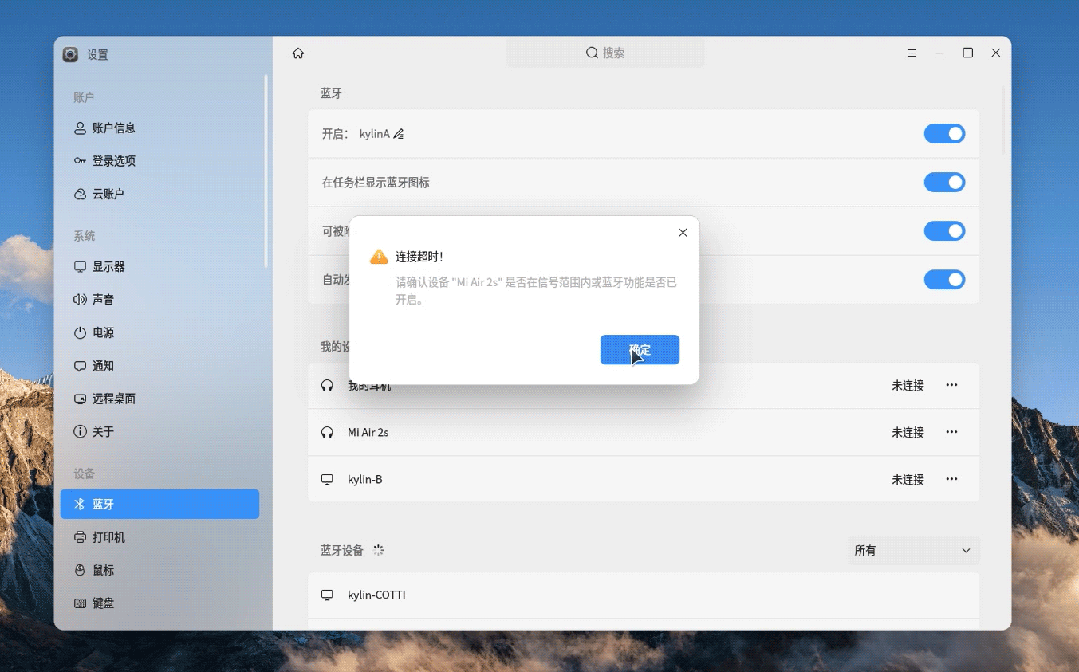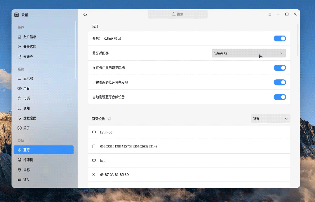 和银河麒麟桌面操作系统已配对过的蓝牙设备,再次打开后会自动与系统进行连接。而且蓝牙连接功能在此基础上增加了防打断特性。例如,如果操作系统与蓝牙设备A和B都成功配对、系统和A设备已成功连接,此时打开B设备,系统蓝牙程序通过智能判断,将继续维持与A设备的连接状态,不会与B设备进行连接。