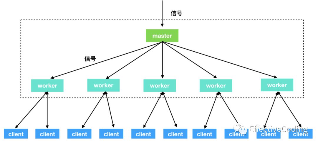 master 主要负责,接受管理员信号向worker发送指令,负责worker进程的生命周期,通知的类型有:worker 不再接受新请求、worker 退出&销毁等,可以把master 看作一个worker 的管理器,我们和master交互来间接管理worker。nginx一些无损重启或者reload配置文件等就是这么来实现的。