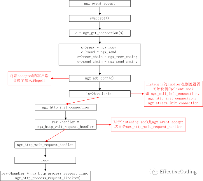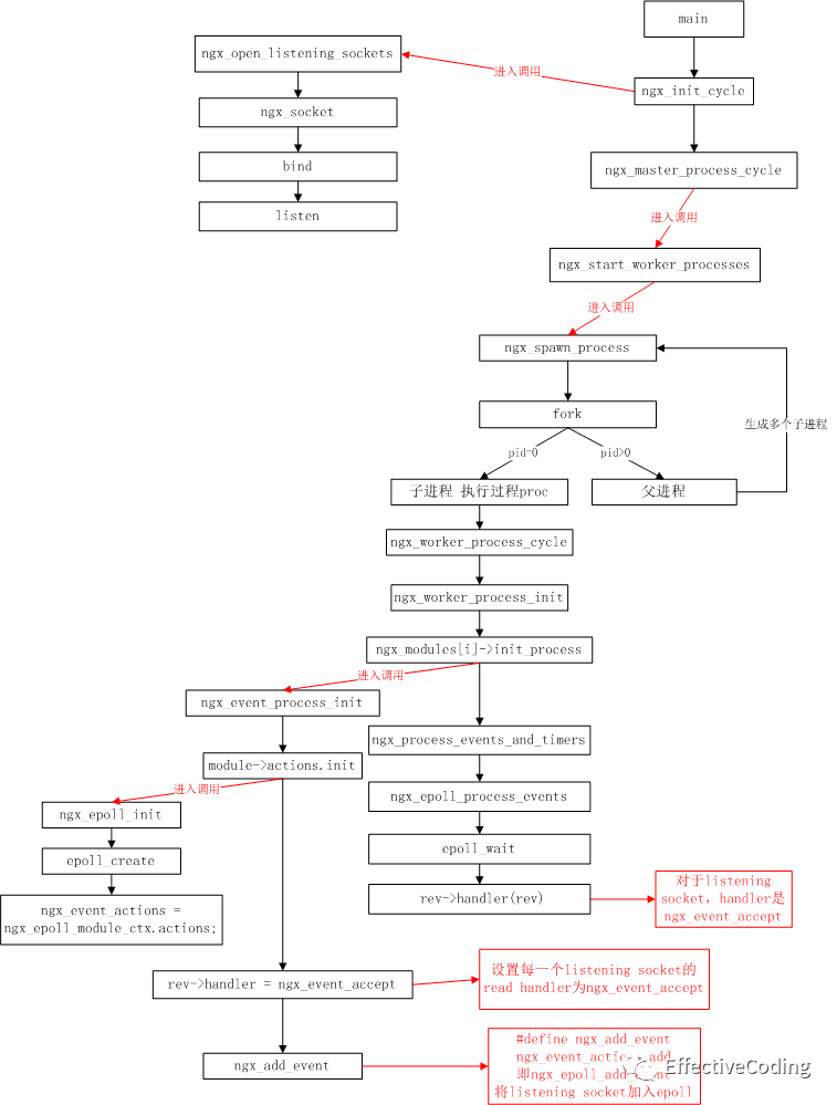 然后从网上盗两张图来看一下nginx 创建监听到accept的流程: