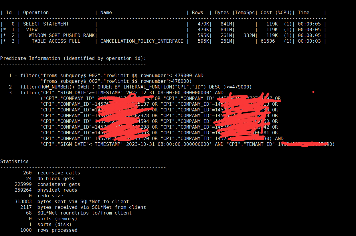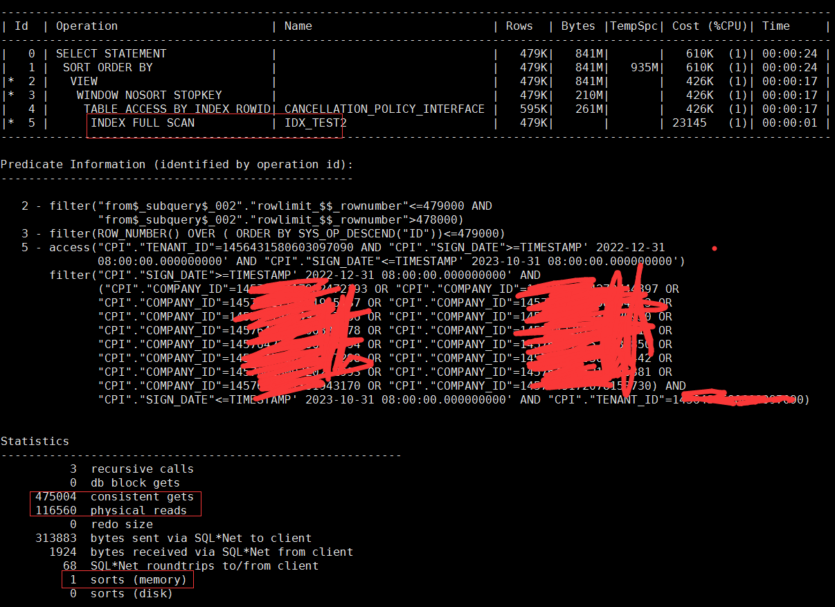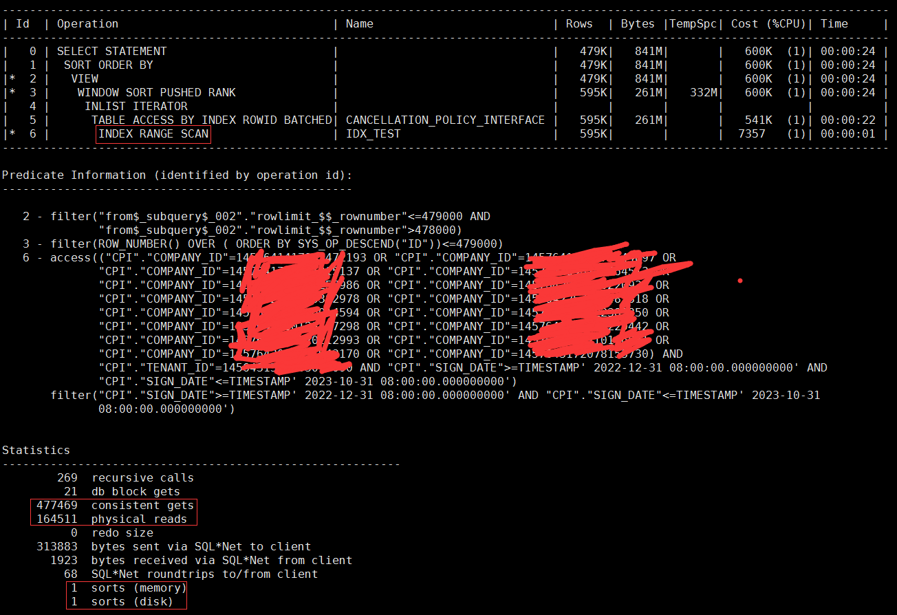 这个地方我暂时还没弄清楚,这个“<=479000”是否已经利用上了传统分页语句中的“count stopkey”特性,我也不太清楚这个“WINDOW SORT PUSHED RANK”是否本身就包含了count stopkey的特性在里面(毕竟没有明显的count stopkey在计划里面显示出来),因为A-Rows这个地方按我的理解是,它是这一步执行完成后,最终返回的记录数量,但实际过程中有可能是将整个数百万结果进行了遍历排序的,而“count stopkey”指的是“只扫描需要的行数就停止扫描并立即返回”,有没有哪位兄弟愿意解惑一下这个呀?看10046/10053什么的实在脑壳疼,我有点儿想白嫖这个知识点。。。