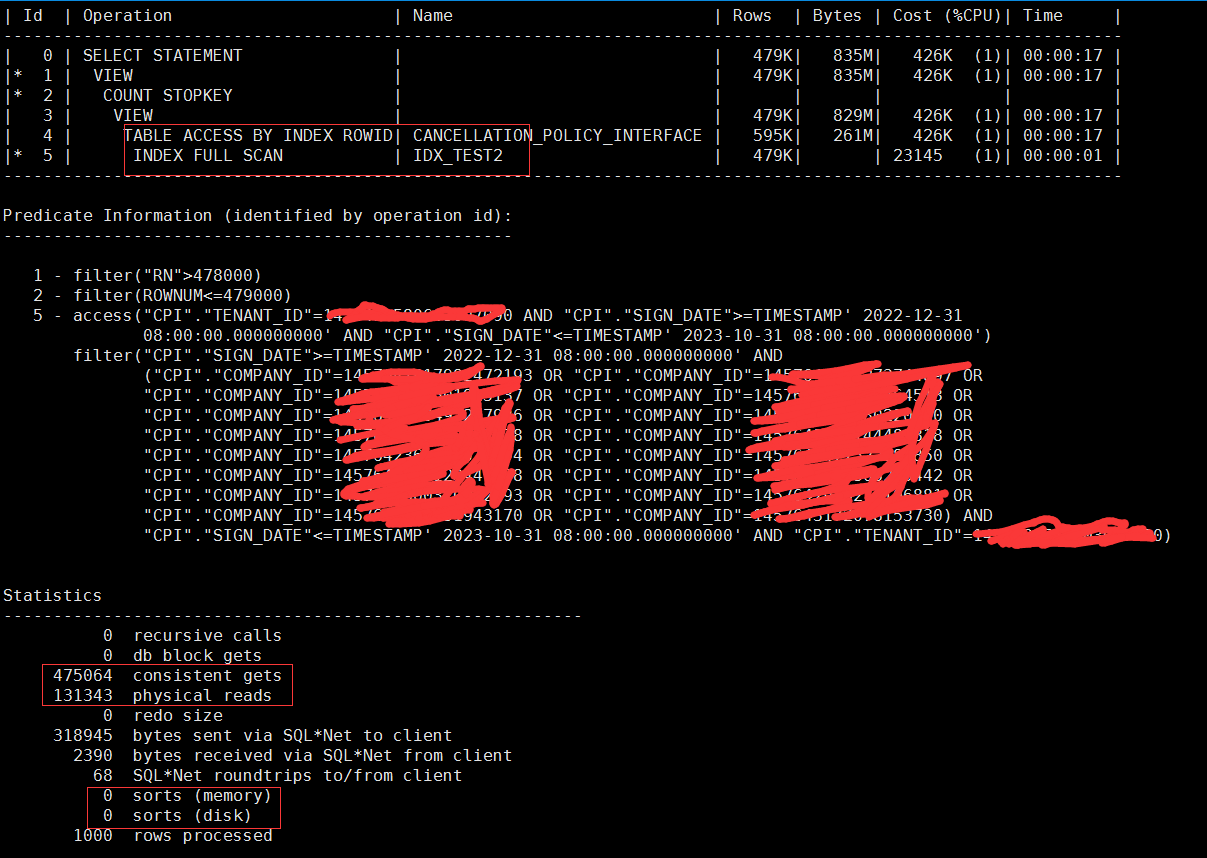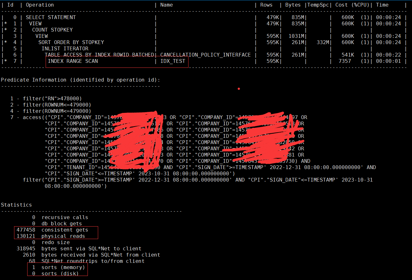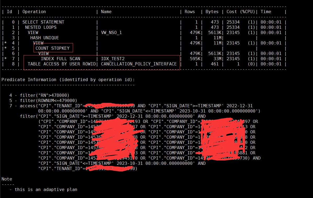 这个地方我暂时还没弄清楚,这个“<=479000”是否已经利用上了传统分页语句中的“count stopkey”特性,我也不太清楚这个“WINDOW SORT PUSHED RANK”是否本身就包含了count stopkey的特性在里面(毕竟没有明显的count stopkey在计划里面显示出来),因为A-Rows这个地方按我的理解是,它是这一步执行完成后,最终返回的记录数量,但实际过程中有可能是将整个数百万结果进行了遍历排序的,而“count stopkey”指的是“只扫描需要的行数就停止扫描并立即返回”,有没有哪位兄弟愿意解惑一下这个呀?看10046/10053什么的实在脑壳疼,我有点儿想白嫖这个知识点。。。