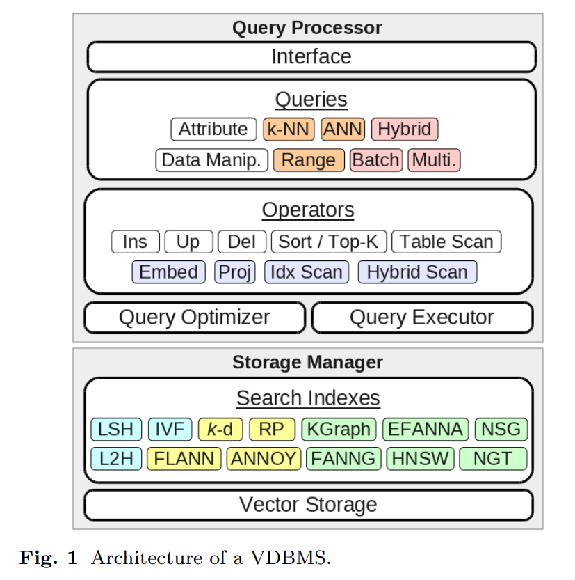 因此,VDBMS中的模块分为查询处理器和存储管理器。查询处理器包括查询规范、逻辑运算符、它们的物理实现以及查询优化器;而存储管理器则维护搜索索引并管理向量的物理存储。这在图1中有所示。这些模块的设计影响了VDBMS的运行时特性。许多应用,如LLMs,都是读取密集型的,需要高查询吞吐量和低延迟。其他应用,如电子商务,也是写入密集型的,需要高写入吞吐量。此外,一些应用需要高查询准确性,这意味着检索到的实体与查询在语义上真正匹配,而其他应用可能对错误更为宽容。因此,开发合适的VDBMS需要了解技术的整体情况以及它们如何影响系统的特性。