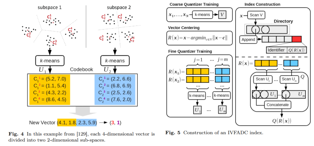 存储和索引。存储管理器主要处理如何组织和存储向量集合以支持高效准确的搜索。对于大多数系统,这是通过向量搜索索引实现的。我们将索引分类为基于表的索引,如E2LSH [49]、SPANN [44] 和IVFADC [69],这些索引通常容易更新;基于树的索引,如FLANN [96]、RPTree [47,48] 和ANNOY [1],旨在提供对数搜索;以及基于图的索引,如KGraph [52]、FANNG [66] 和HNSW [90],已经被证明在经验上表现良好,但理论理解较少。为了解决划分向量集合的难题,技术包括随机化[67,49,31,96,48,52,123,115]、学习划分[127,69,91,96,112]以及我们称之为“可导航”的划分[51,89,90]。为了处理大存储大小,已经为压缩向量上的索引开发了几种技术,包括量化[62,69,91,113,129,133],以及基于磁盘的索引[61,44]。我们在第3节中讨论索引。