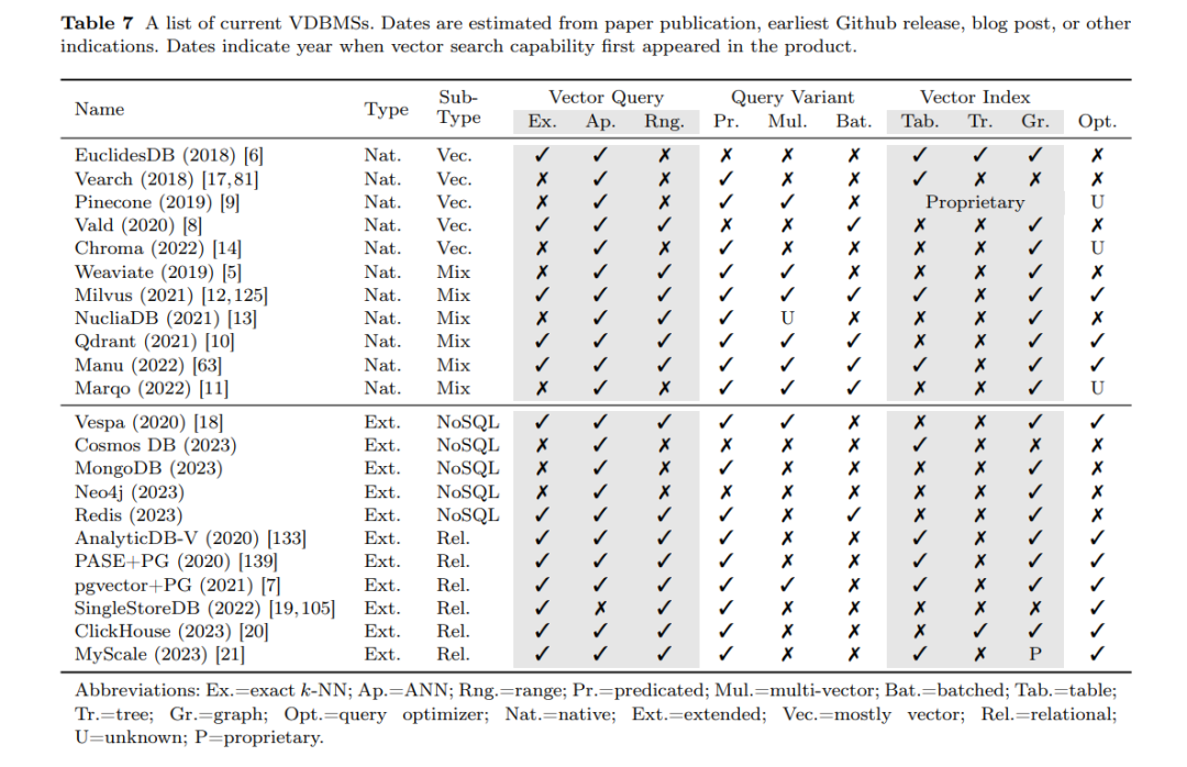 当前系统。我们将现有的VDBMSs分类为原生系统,这些系统专门围绕向量管理设计,包括Vearch [81]、Milvus [125] 和Manu [63];扩展系统在现有的数据管理系统之上增加向量功能,包括AnalyticDB-V [133] 和PASE [139];以及搜索引擎和库,旨在仅提供搜索功能,如Apache Lucene [2]、Elasticsearch [3] 和Meta Faiss [4]。原生系统往往更倾向于针对特定功能的高性能技术,而扩展系统往往更倾向于适应不同工作负载但不一定是最快的技术。我们在第5节中调查当前的系统。