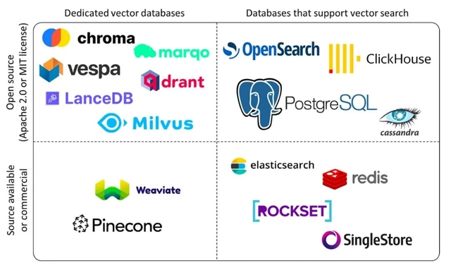 目前,市场上的涌现出一批向量数据库。技术原理上,一种是关系型数据库或NoSQL数据库,增加向量嵌入存储,但它们最初都没有设计用于存储和提供这种类型的数据。例如最为常见的pgvector插件,可以通过嵌入方式在PostgreSQL 数据支持存储和使用。另一种是原生的向量数据库,即在诞生之初就定位为专项数据库产品。Milvus 是一个于 2019 年首次发布的开源矢量数据库。