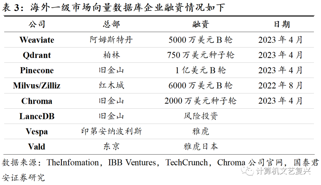 从近期的融资来看,资本角度非常看好这一领域(如下图)。向量数据库正在被定义为一种“AI 基础设施”。从市场空间来看,AI技术的发展将推动向量数据应用与存储需求加速增长:一方面随着AI应用场景不断丰富,向量数据库的下游客户数量随着AI发展而飞速增长;另一方面AIGC正推动着非结构化数据应用飞速增长,AIGC带来了跨模态数据分析的需求浪潮,只有向量数据库才能实时快速地处理这些海量的向量数据。