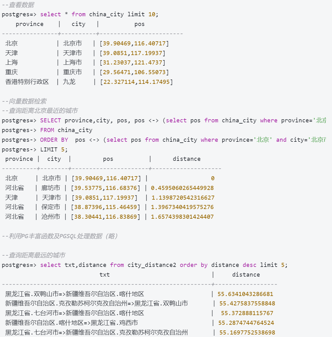 下面构建一个测例,在 PostgreSQL 中使用 pgvector 插件测试对向量数据的检索。向量数据集采用公开的国内省市位置数据,将经纬度作为向量维度存储。通过欧几里德距离计算向量数据间距离(即城市间距离)。