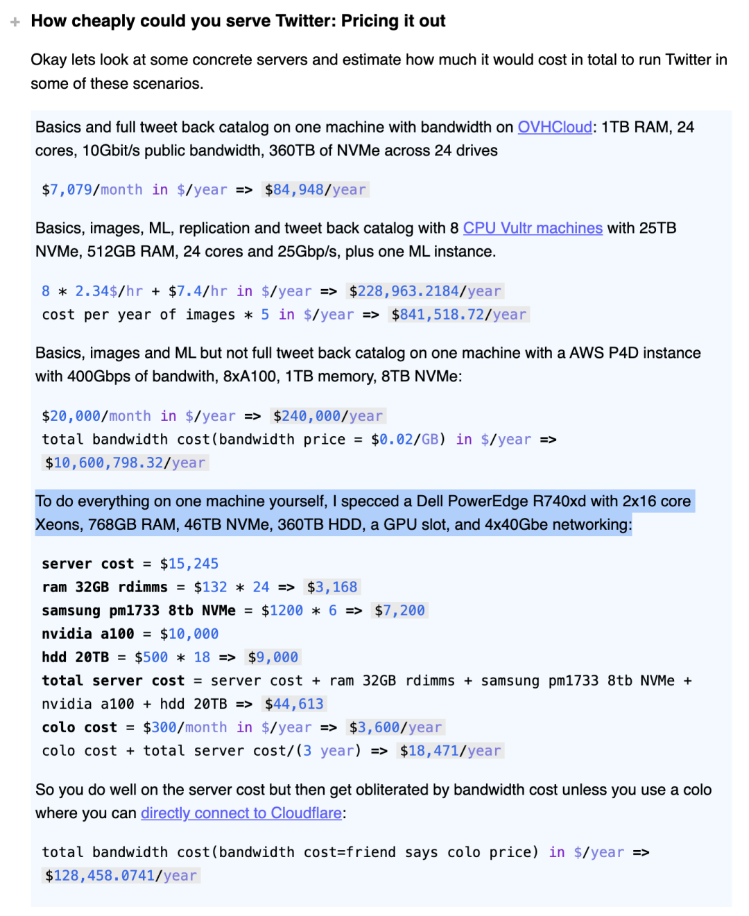 在当下,一台普通x86服务器的能力上限已经达到了一个非常惊人的程度 —— 这里有一个有趣的草稿演算[4],粗略证明了将整个 Twitter 运行在一台这样的现代服务器上的可行性( Dell PowerEdge R740xd,32C,768GB RAM、6TB NVMe、360TB HDD、GPU插槽和 4x40Gbe 网络)。尽管出于生产冗余的考虑你并不会这么做(用两台或者三台可能更保险一些),但这个计算确实抛出了一个很有趣的问题 —— 可伸缩性是否还是一个真正的问题?