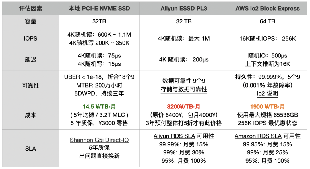 而AWS与阿里云的对应块存储TB·月成本在满打满算折扣的情况下分别为 1900 与 3200。在最离谱的情况下(6400 vs 6.6 )溢价甚至可以达到千倍,不过更为 Apple to Apple 的对比结果:云上块存储的单位价格是自建的 100 ~ 200 倍 (而且性能并没有本地磁盘好)。
