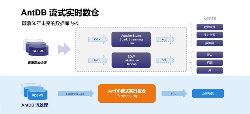 亚信安慧AntDB做了大量从零开始的创新性探索与研究,于2022年底推出AntDB-S实时实时数仓,彻底将流式计算与传统交易、分析型数据存储进行了融合,让用户可以在数据库引擎内,通过标准SQL自由定义数据的结构以及实时处理逻辑。技术堆栈简化:在实时流事件的处理上,AntDB流式处理一体引擎将大量的实时数据处理做到数仓内部,更进一步向通用事务靠拢。标准SQL定义:传统流处理方式对于SQL 的处理很弱,还要写大量业务代码,而AntDB-S可以通过统一SQL语句进行处理,流的使用上更便捷。统一数据接口:支持流批模式的转换,AntDB统一超融架构,实现了对外的接口统一,数据的采集与处理无需分开,流批都用SQL 即可全部搞定。支持完整事务处理:传统流处理过程中不支持数据的修改,AntDB-S支持流处理中对数据的修改和事务操作。实时结果更准确:通过分布式事务的ACID特性,解决实时流数据处理中,数据容灾和一致性的问题,可以精确判断数据故障点,完成流事件的矫正计算和重统计。由上图可以看出,流数据库是把流处理功能融合进AntDB-T的SQL引擎中;把流数据的存储融合进AntDB-T的存储引擎;把流处理的进程体系结构融合进AntDB-T的进程体系结构中。(2)学习和维护成本低,只需掌握数据库的使用和维护即可。(3)完全用SQL操作所有功能,使用简单方便。SQL是被实践证明了的最好的数据处理语言,能够快速响应业务的复杂多变性。(4)流数据处理支持数据UPDATE和DELETE、事务ACID、且可以流表JOIN。AntDB数据库始于2008年,在运营商的核心系统上,为全国24个省份的10亿多用户提供在线服务,具备高性能、弹性扩展、高可靠等产品特性,峰值每秒可处理百万笔通信核心交易,保障系统持续稳定运行近十年,并在通信、金融、交通、能源、物联网等行业成功商用落地。https://asiainfo.gokuai.com/file/mzbmzb1htwk8y7bmjqobatviasp3s09x#https://asiainfo.gokuai.com/file/mzbmzb1htwk8y7bmjqobatviasp3s09x#