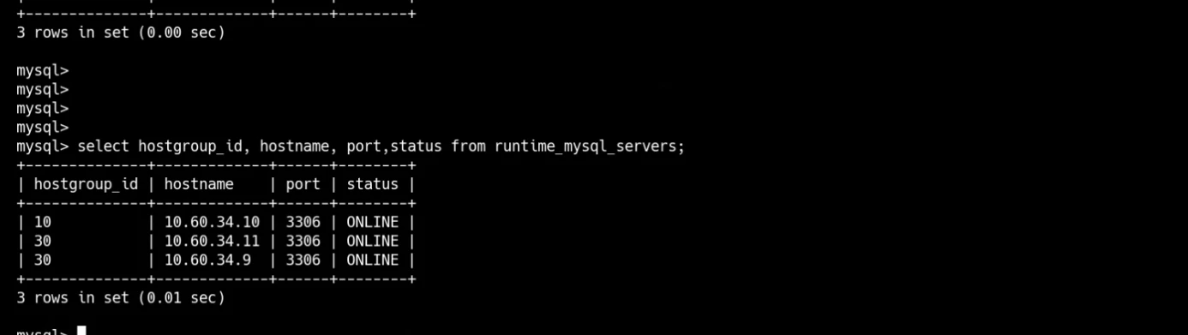 insert into mysql_servers(hostgroup_id,hostname,port) values (10,'10.60.34.10',3306); insert into mysql_servers(hostgroup_id,hostname,port) values (10,'10.60.34.9',3306); insert into mysql_servers(hostgroup_id,hostname,port) values (10,'10.60.34.11',3306); load mysql servers to runtime; save mysql servers to disk;