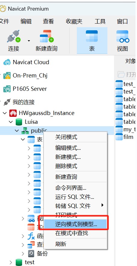 右键单击已打开的数据库或模式、表或视图,然后从弹出式菜单中选择“逆向数据库到模型”、“逆向模式到模型”、“逆向表到模型”或“逆向视图到模型”。